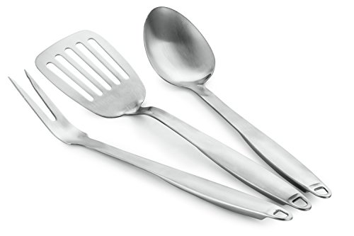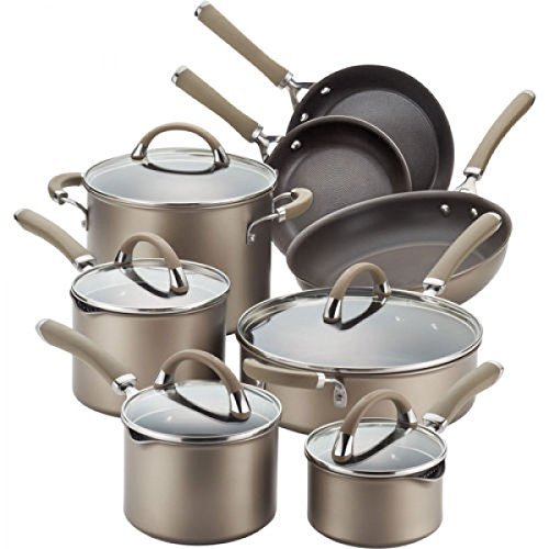- The 12-piece cookware set boasts dual-riveted rubberized stainless steel handles and shatter-resistant glass lids; includes slotted turner and spoon